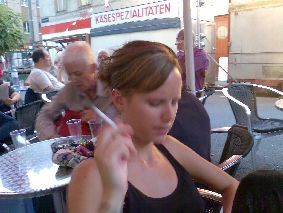 Marktstandler spielen - dann Wechsel in ein Cafe an der Brunnengasse. Die